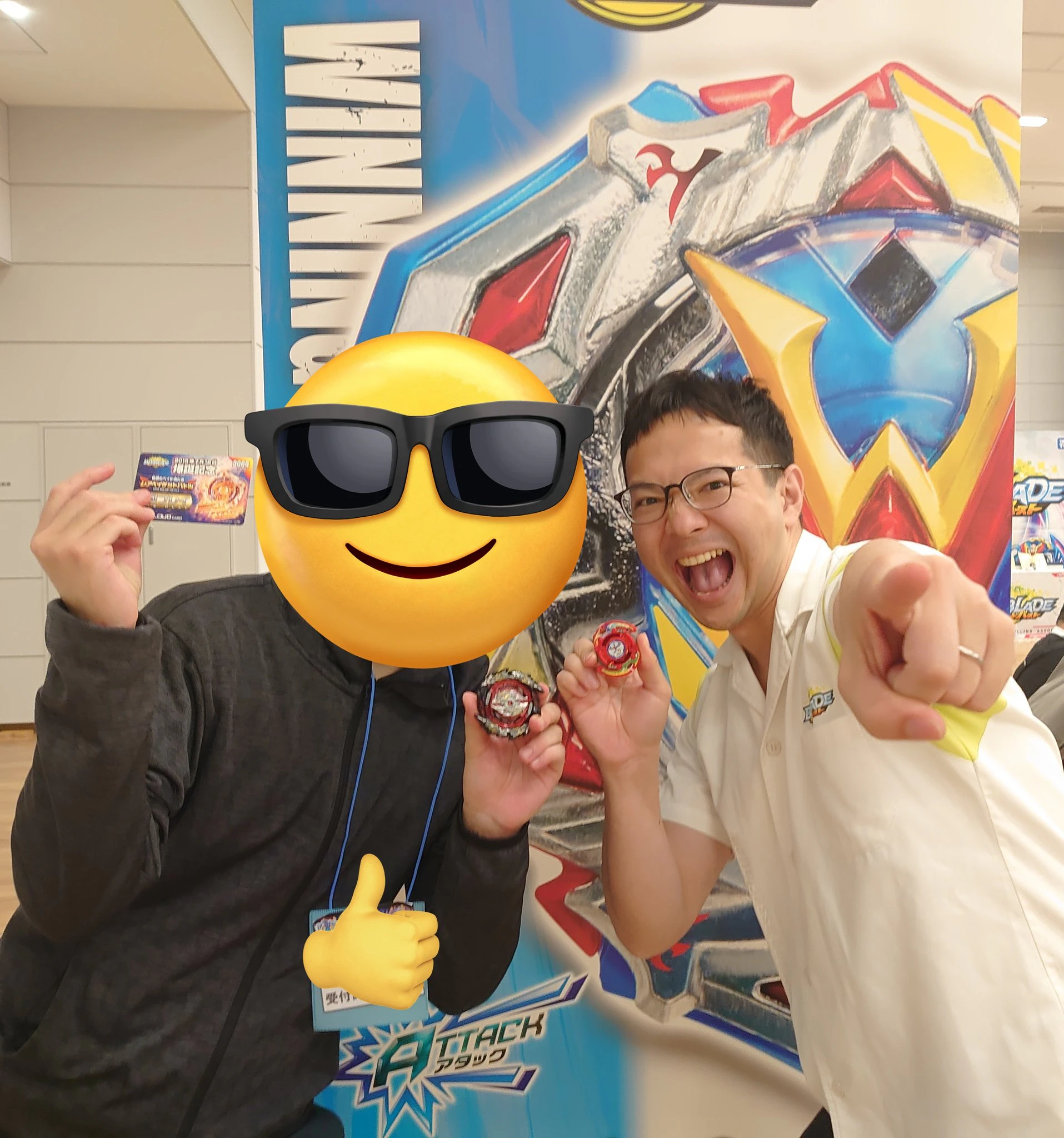 また、発売日よりも前からベイブレードバーストをしているブレーダーの証として、当時イオンとかで開催されていた先行体験会のときに頂いたベイポイントカードを持ってきていました。それを見た村木さんは「懐かしい!」と言ってくれて、ぼくは「その頃からずっとバーストやってます!」と伝えることが出来ました。8年分の感謝を開発者に直接伝えることができたので本当に良かったです。