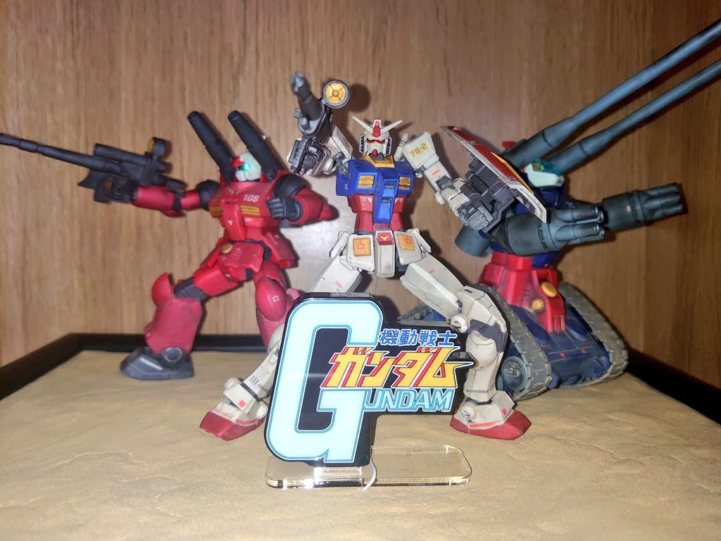プレバンでなんとなく買ったアクリルロゴディスプレイをどうやって有効活用しようかな……と考えた結果、「ガンダムとガンキャノンとガンタンクを並べてそこにロゴを飾ろう!」と思い付き、そのまま勢いで作ったものです。昨今のガンプラ事情によってガンタンクとガンキャノンを購入するのが大変でしたが、なんとか買えました。個人的に今まで作ったガンプラの中でかなりお気に入りです。