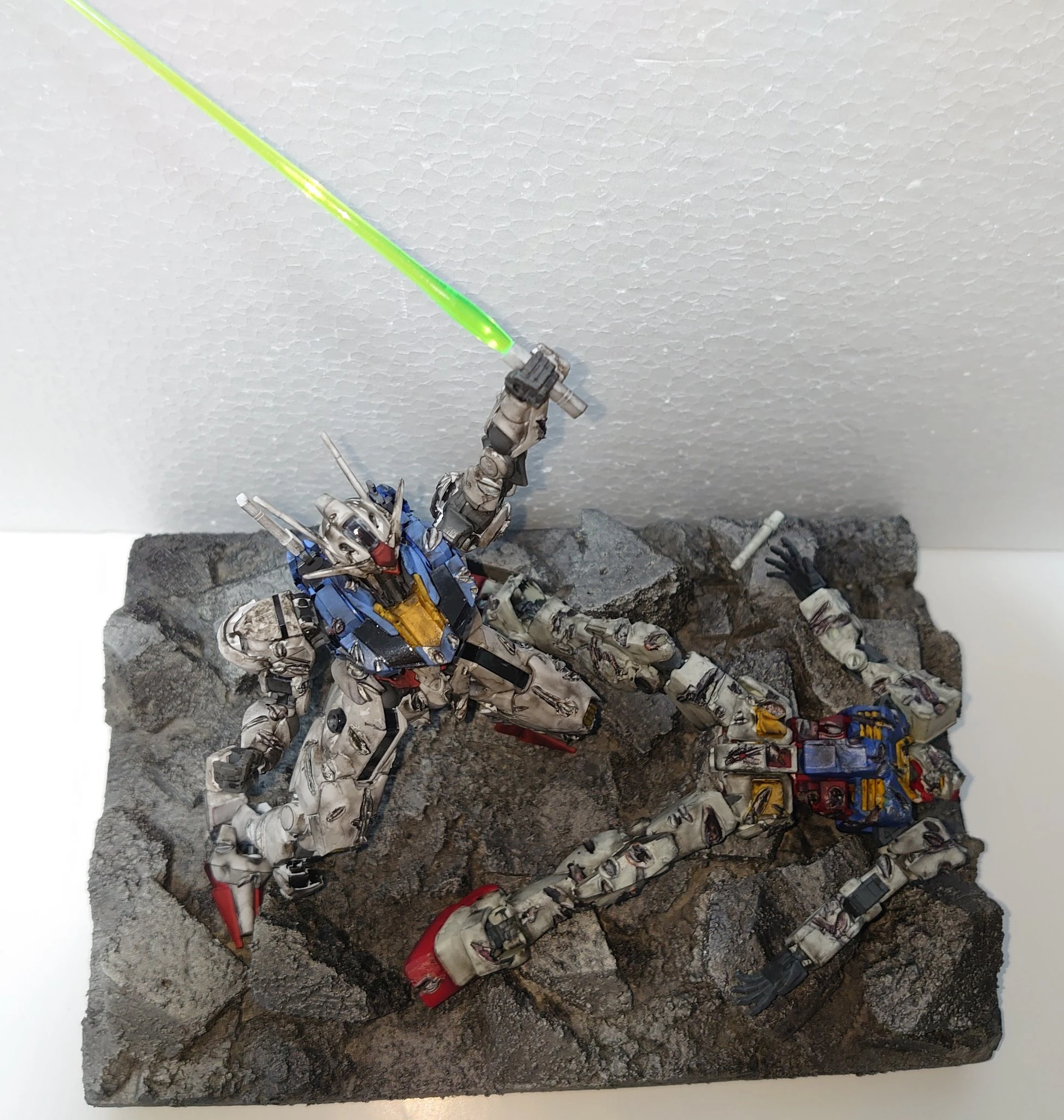 エアリアルとRX-78-2の決闘をイメージしたジオラマです。決闘なのでビームサーベルは緑のやつを別のキットから流用して加工しました。