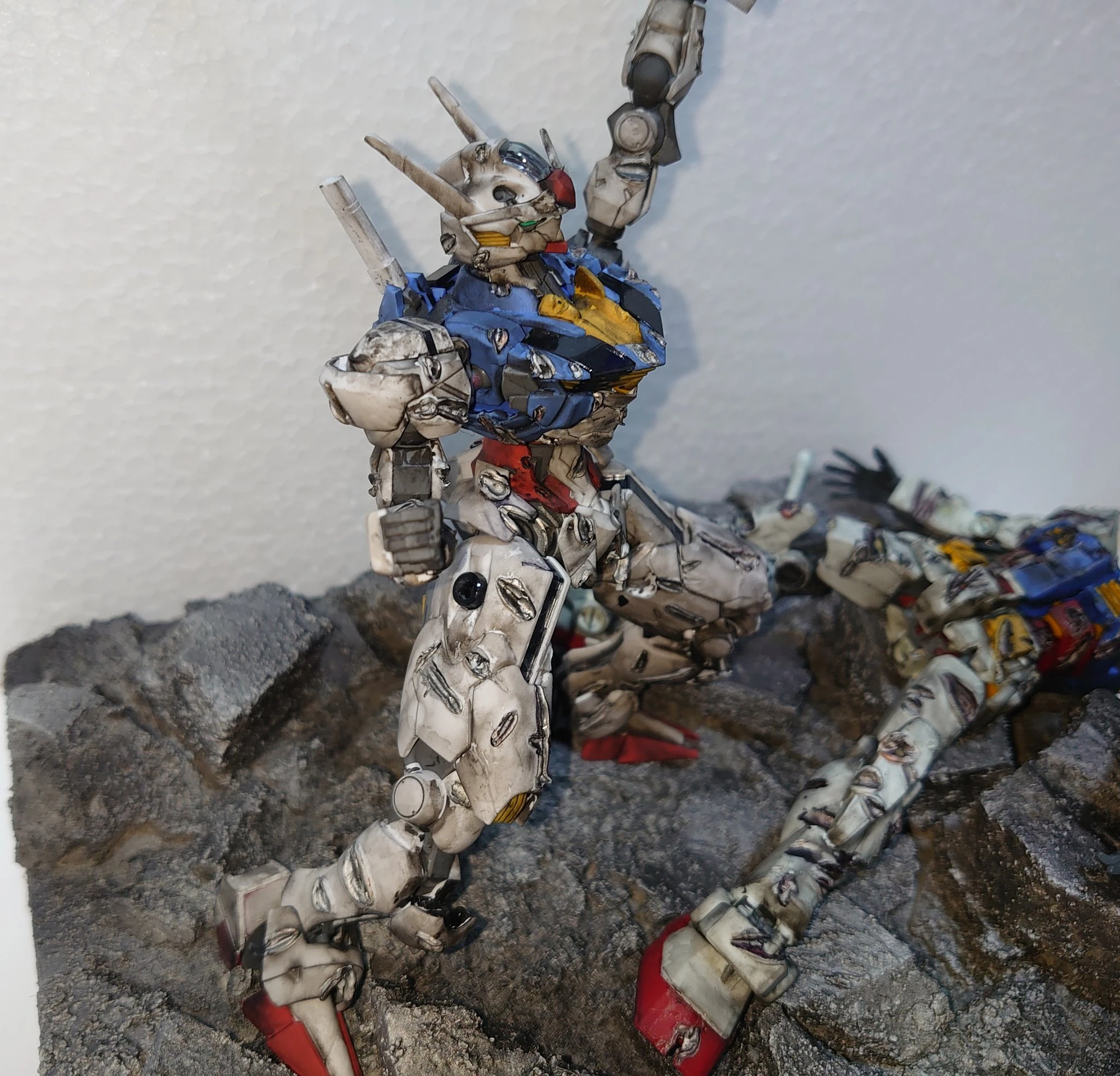 このジオラマを作ろうと思ったきっかけですが、水星本編を見てる時にエランの「ガンダムに勝てるのはガンダムだけだ」という台詞を聞いて、エアリアルが初代ガンダムを倒す情景を思い浮かべました。そのときの脳内イメージを具現化したものになります。もちろんアドステラと宇宙世紀は別の世界なのでこのような対戦カードはあり得ないのですが、ガンプラは自由なのでおっけーです(正暦を導入すれば無理矢理同じ世界にできるけども)。アムロがアスティカシア学園で初代ガンダムを使うIF世界ということでどうでしょうか。どうでもいいけどアムロはメカニック科に所属してそう。そして「メカニック科なのにパイロット適正がヤベー奴」って噂になってそう。